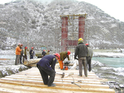 2008年10月底,西藏的天气已是天寒地冻,江水已陆续结冰,正值雅鲁藏布江枯水季节,水位处于最低位置,这无疑是桥梁桩基施工的最佳时机。以项目经理房清为首的班子成员确定了“快进场、抓开工、开好局”的工作思路,他们带领百余号参建人员冒着严寒,浩浩荡荡开进雅鲁藏布江大桥建设工地,开始项目筹建工作。自10月底进场筹建以来,项目部积极协调业主、地方政府抓施工用地征拆、临时用地规划,只用了短短12天时间,取得了桥梁下部结构施工用地,完成生产、生活临时房屋建设6500余平方米。