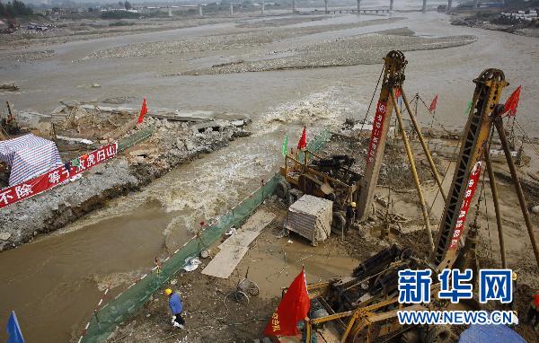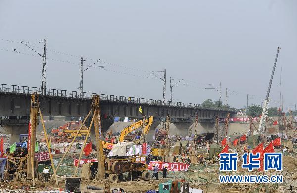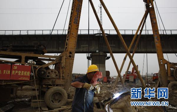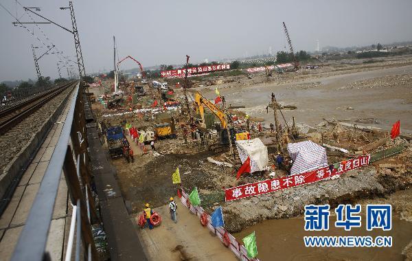 (新华社记者 江宏景) 9月1日,中铁二局的建设者们在石亭江大桥重建处加紧施工。当日,宝成铁路石亭江大桥新桥建设举行决战60天誓师大会,按照拆除残桥、巧建墩台、铺架成桥三大阶段,力争10月20日完成工程目标。石亭江大桥重建已于8月21日开始。目前,拆除残桥工作已经完成,挖钻打孔基础施工已经开始,其他工程稳步推进。据悉,该项重建工程线路全长790米,主要包括原位重建石亭江大桥和石亭江支流中桥。该工程时间紧、任务重,旧桥拆除和新桥基础施工难度大。8月19日,宝成铁路广汉段石亭江大桥桥墩被洪水冲垮,造成列车脱轨事故,幸无人员伤亡。损毁的旧桥被拆除,铁路段内将建设一座300米长的钢筋混凝土新桥。